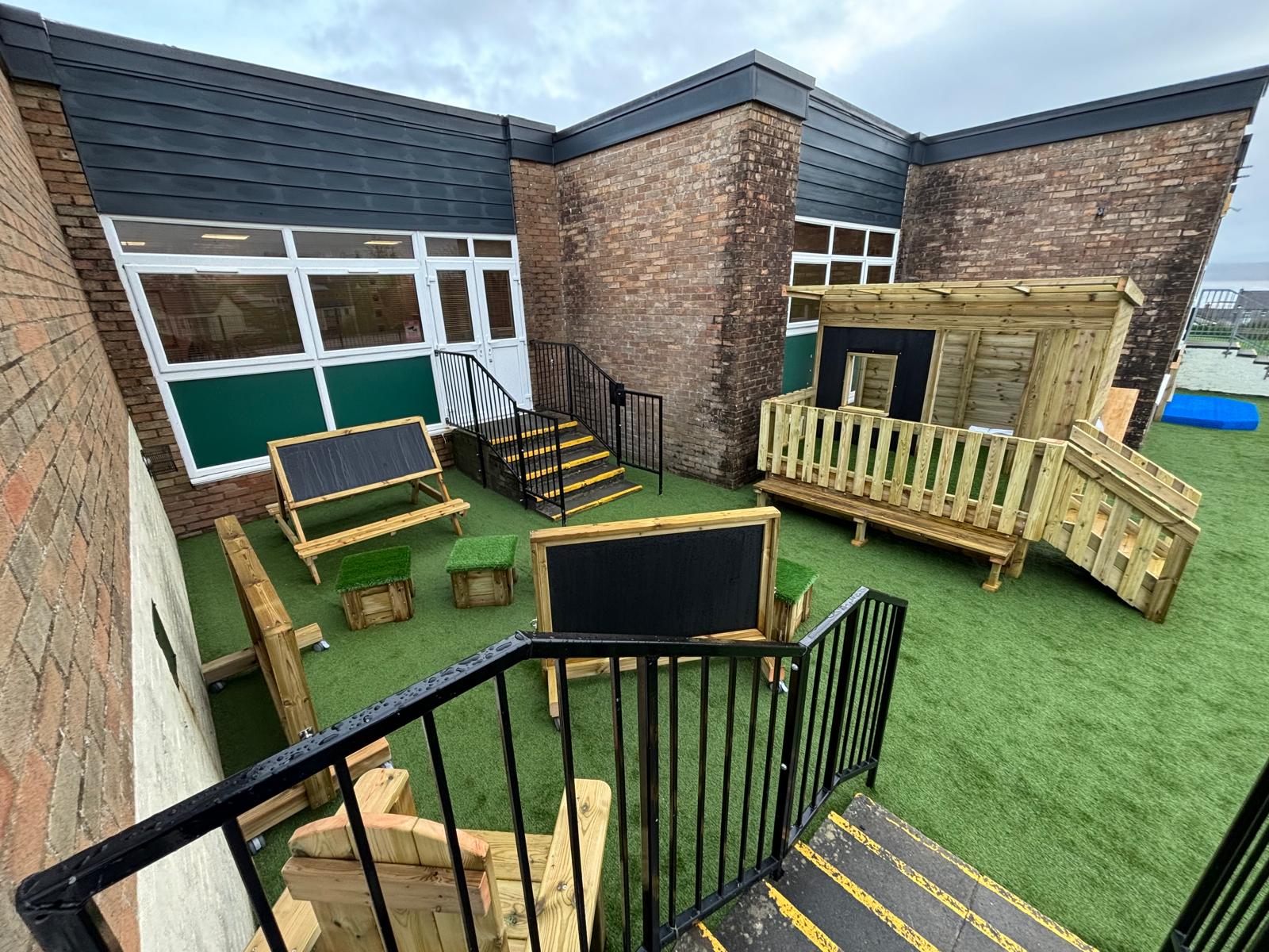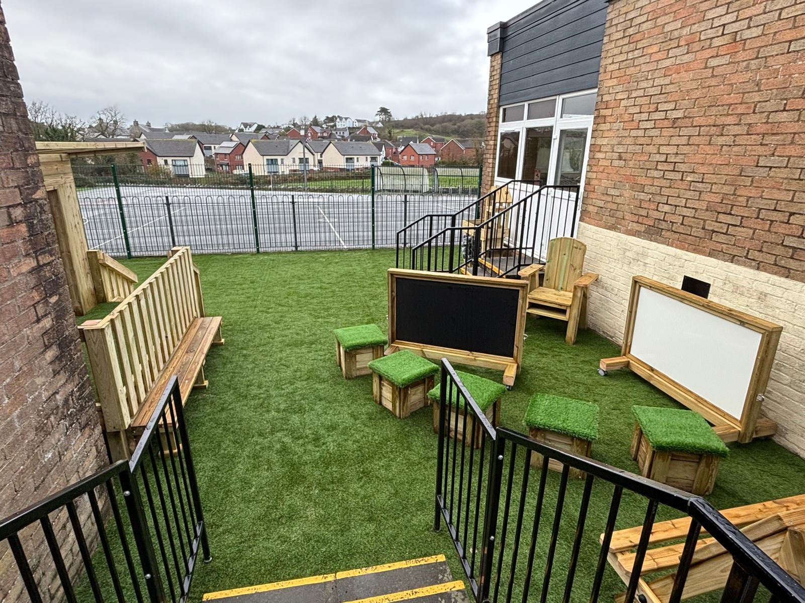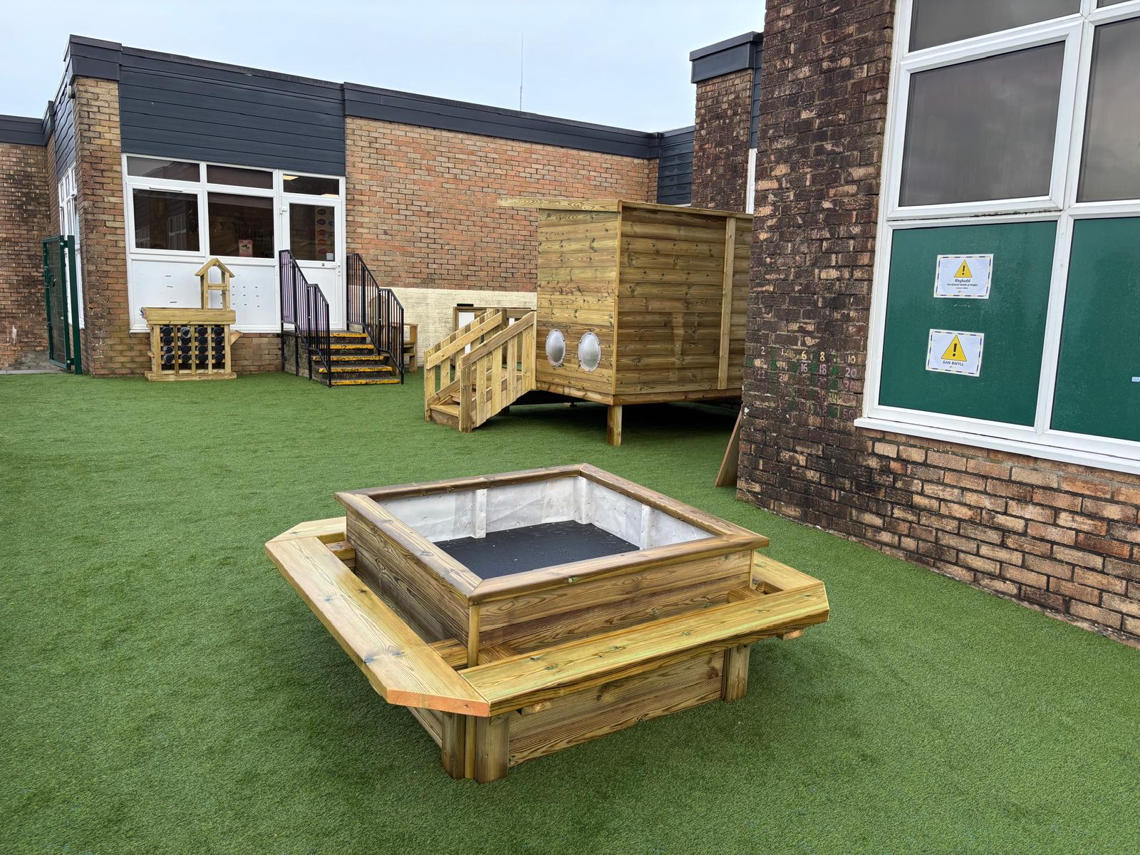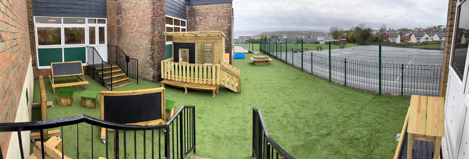 Mae’r ardal yn cynnwys arwyneb glaswellt ‘pob tywydd’, caban gwyliwr, gwesty trychfilod, gwely plannu mawr, eisteddleoedd awyr agored, bwrdd sialc, îsl awyr agored a llawer mwy. Cafodd ei chynllunio’n ofalus  gan ddefnyddio offer diogel a chadarn, a fydd yn gwella cyfleoedd dysgu dychmygus ac ymarferol drwy chwarae.