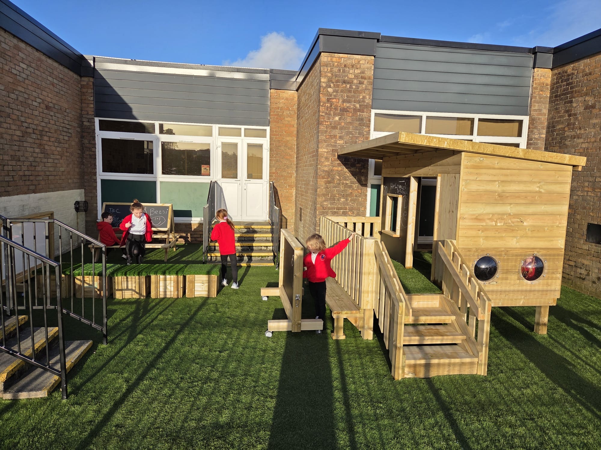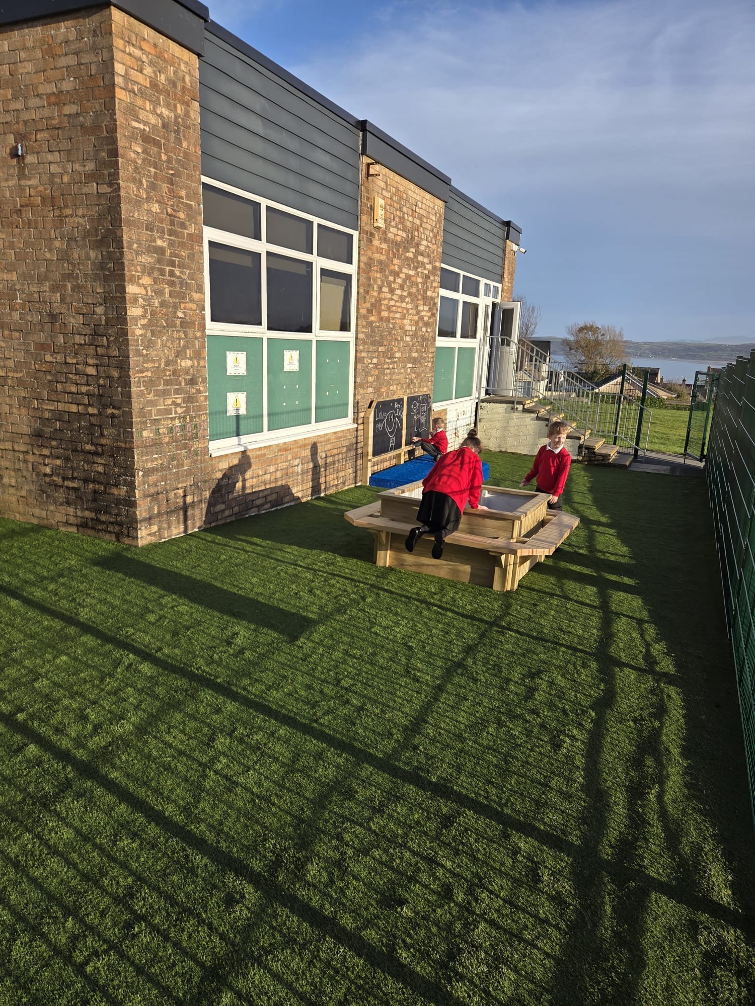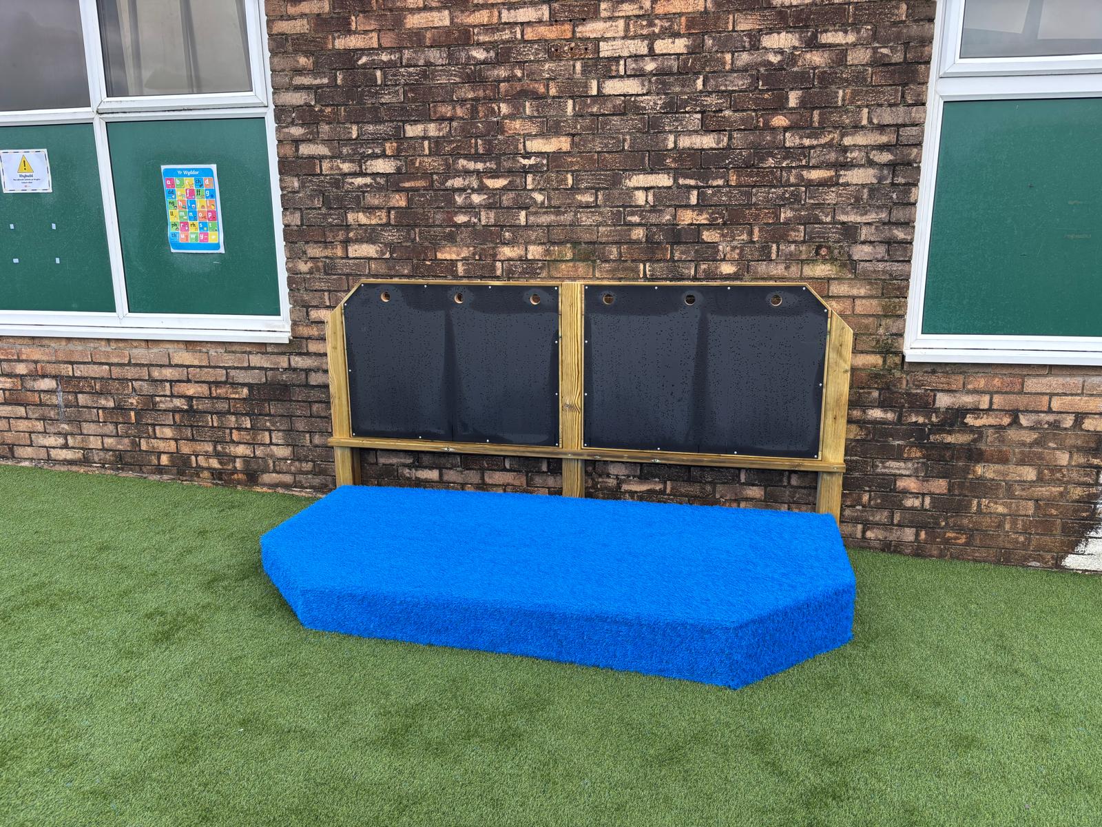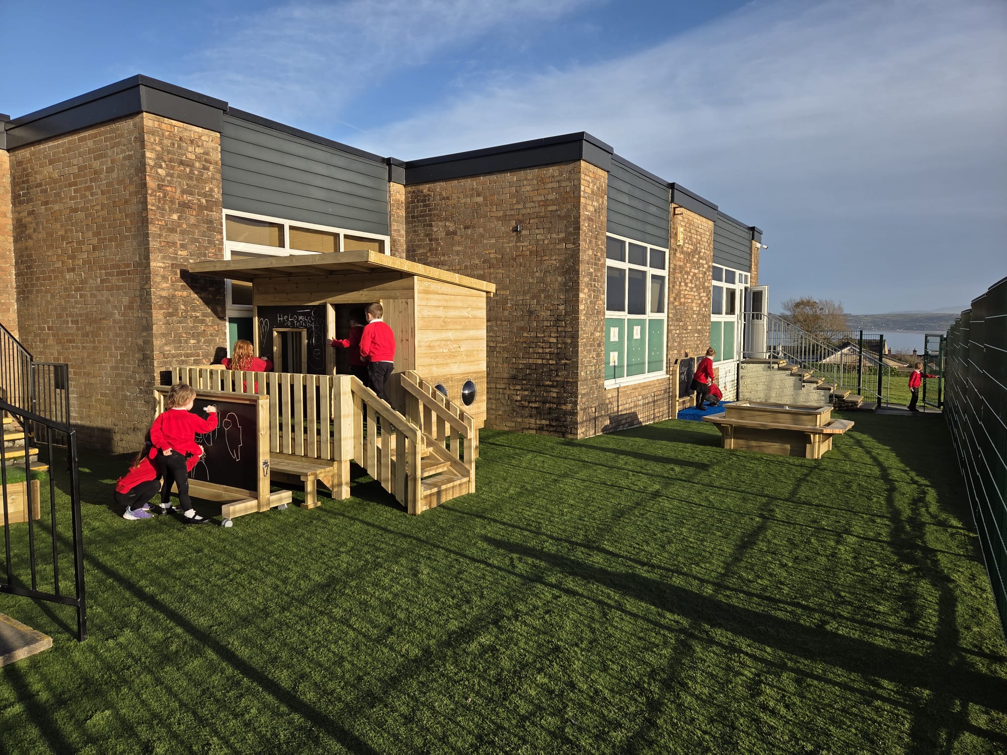 Mae’r ardal yn cynnwys arwyneb glaswellt ‘pob tywydd’, caban gwyliwr, gwesty trychfilod, gwely plannu mawr, eisteddleoedd awyr agored, bwrdd sialc, îsl awyr agored a llawer mwy. Cafodd ei chynllunio’n ofalus  gan ddefnyddio offer diogel a chadarn, a fydd yn gwella cyfleoedd dysgu dychmygus ac ymarferol drwy chwarae.