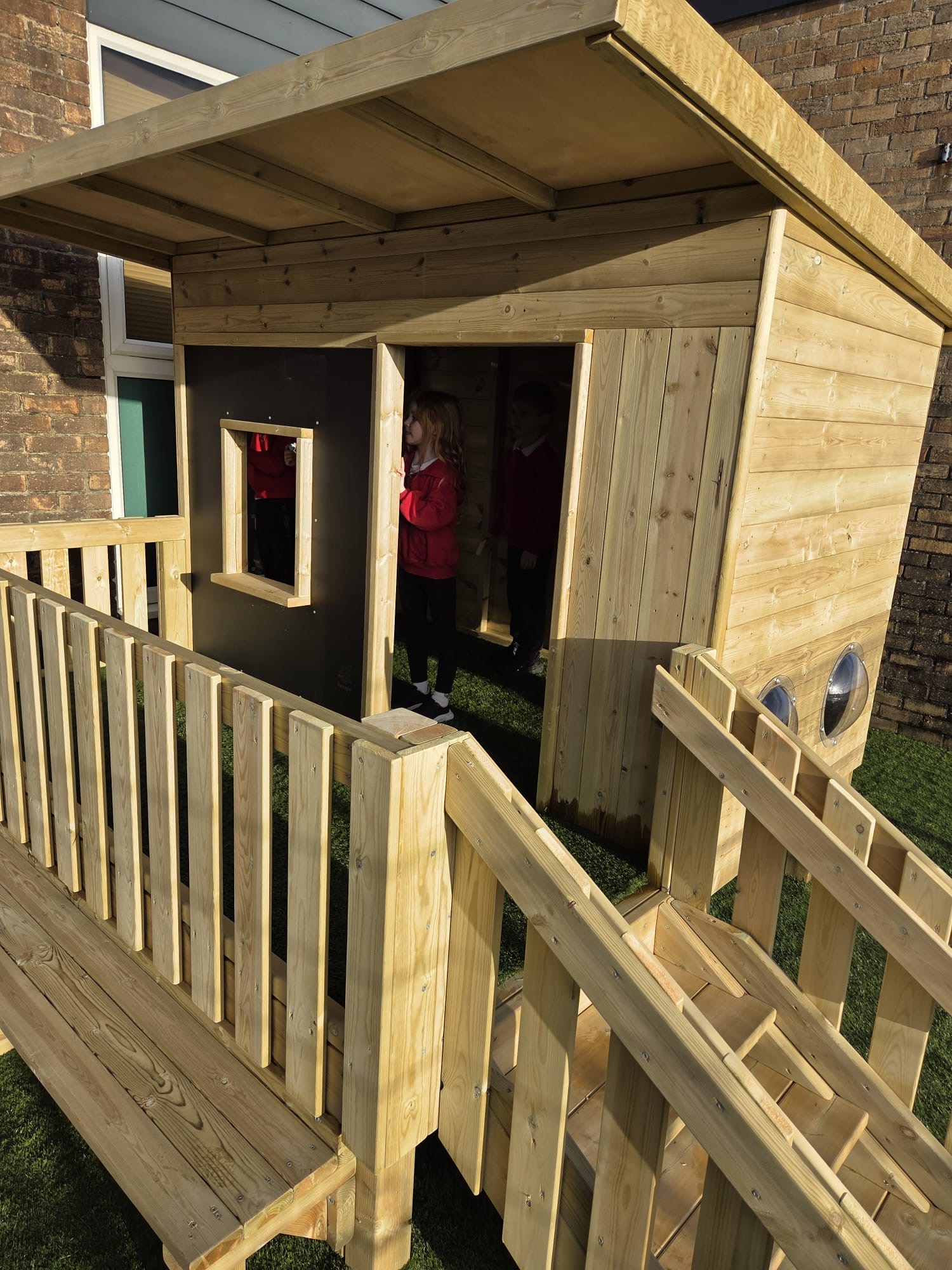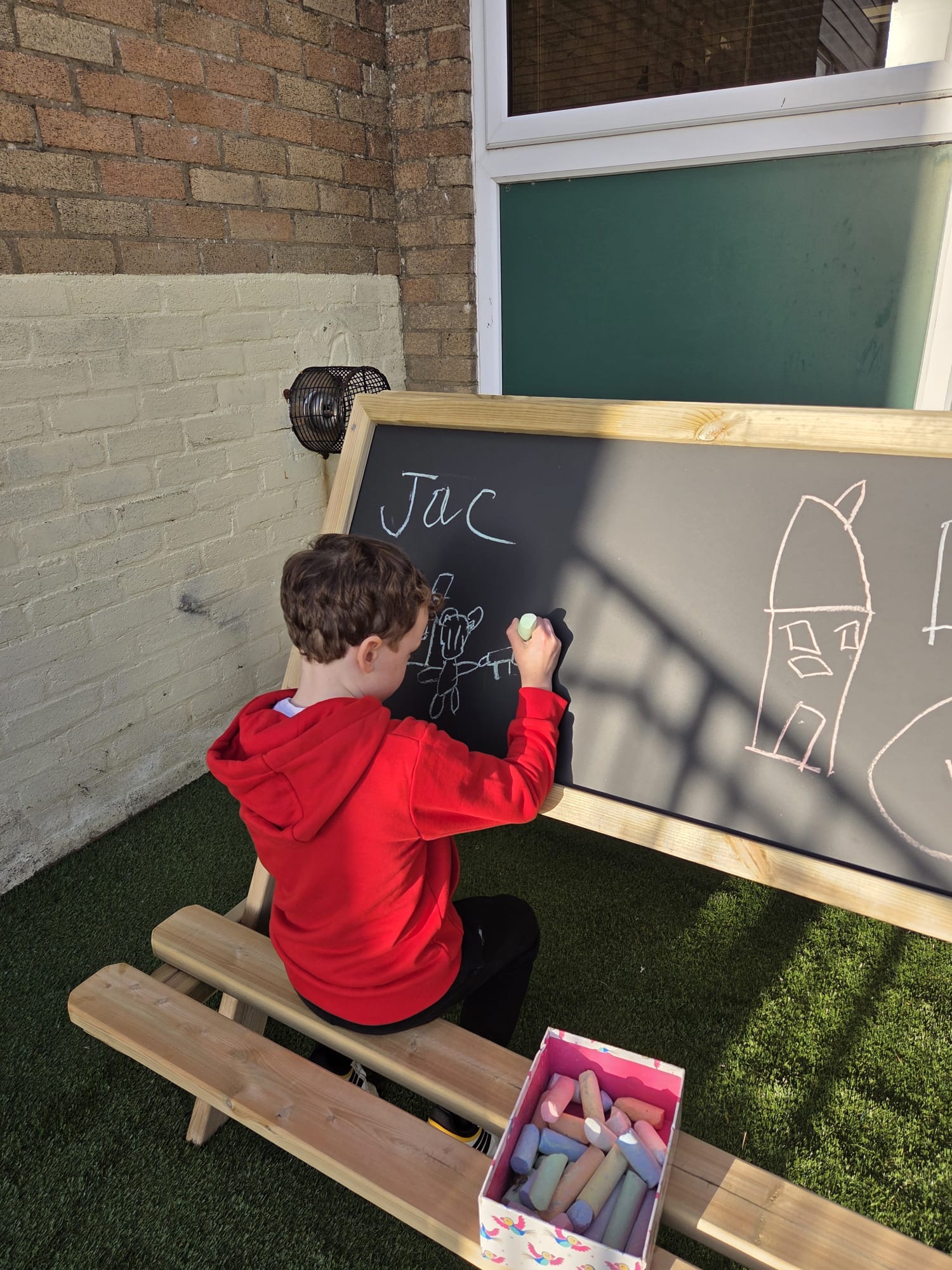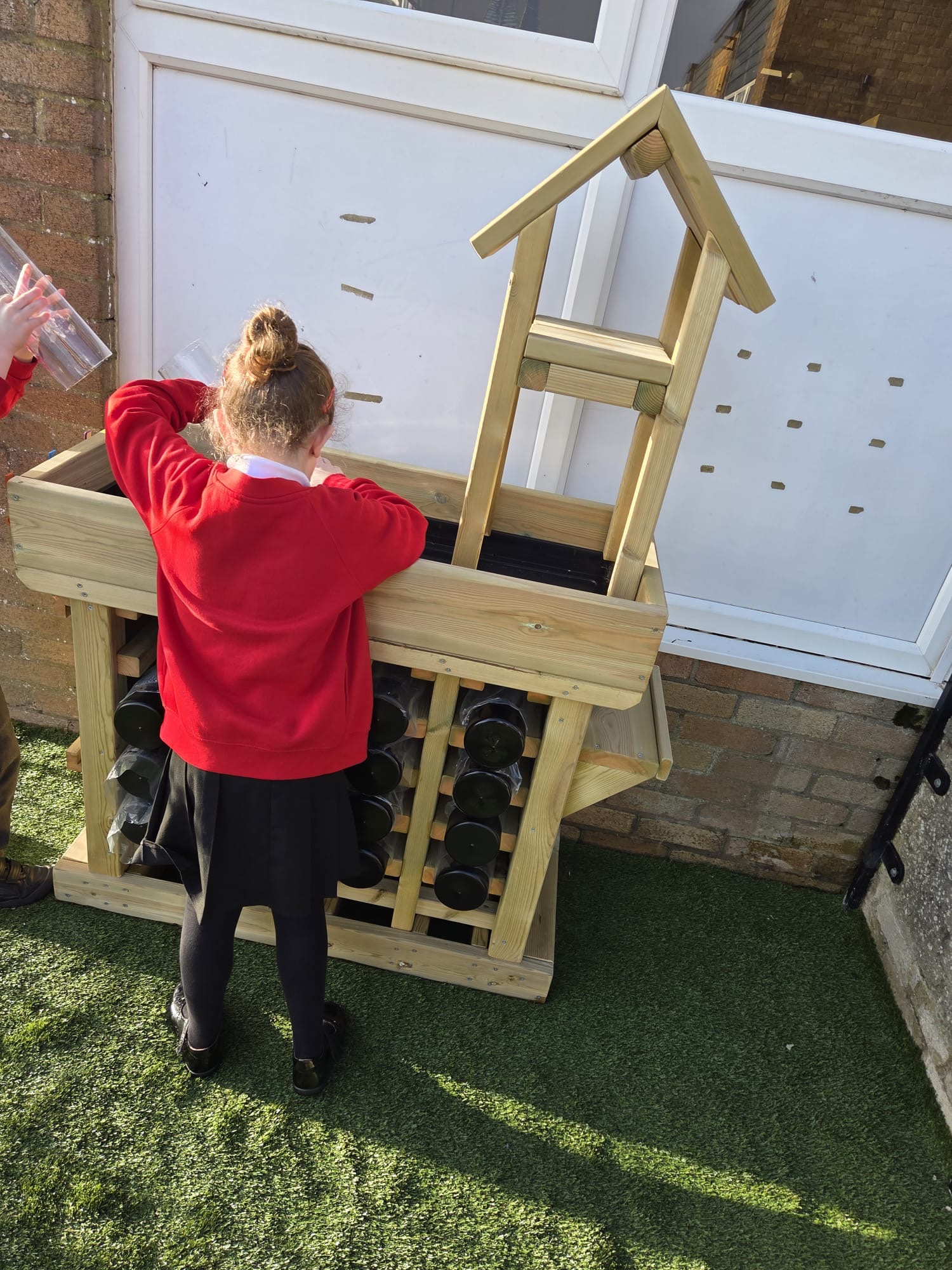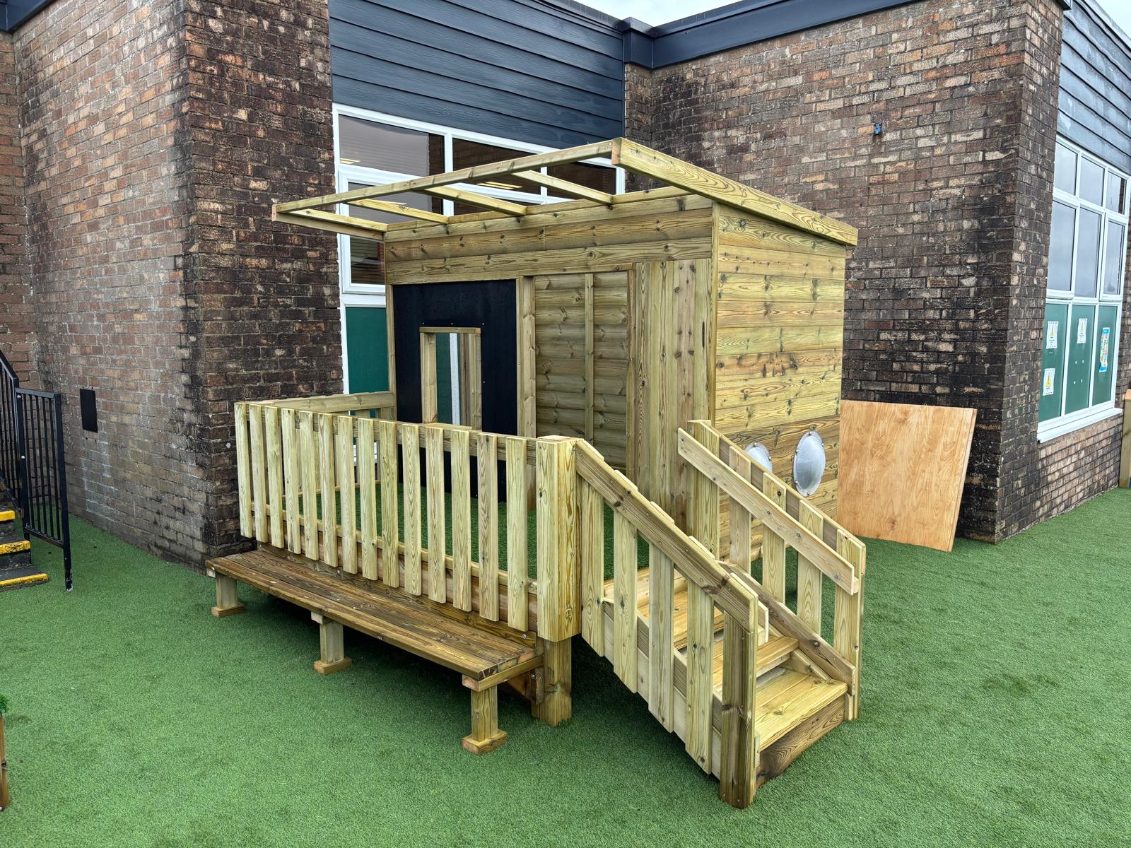 Mae’r ardal yn cynnwys arwyneb glaswellt ‘pob tywydd’, caban gwyliwr, gwesty trychfilod, gwely plannu mawr, eisteddleoedd awyr agored, bwrdd sialc, îsl awyr agored a llawer mwy. Cafodd ei chynllunio’n ofalus  gan ddefnyddio offer diogel a chadarn, a fydd yn gwella cyfleoedd dysgu dychmygus ac ymarferol drwy chwarae.